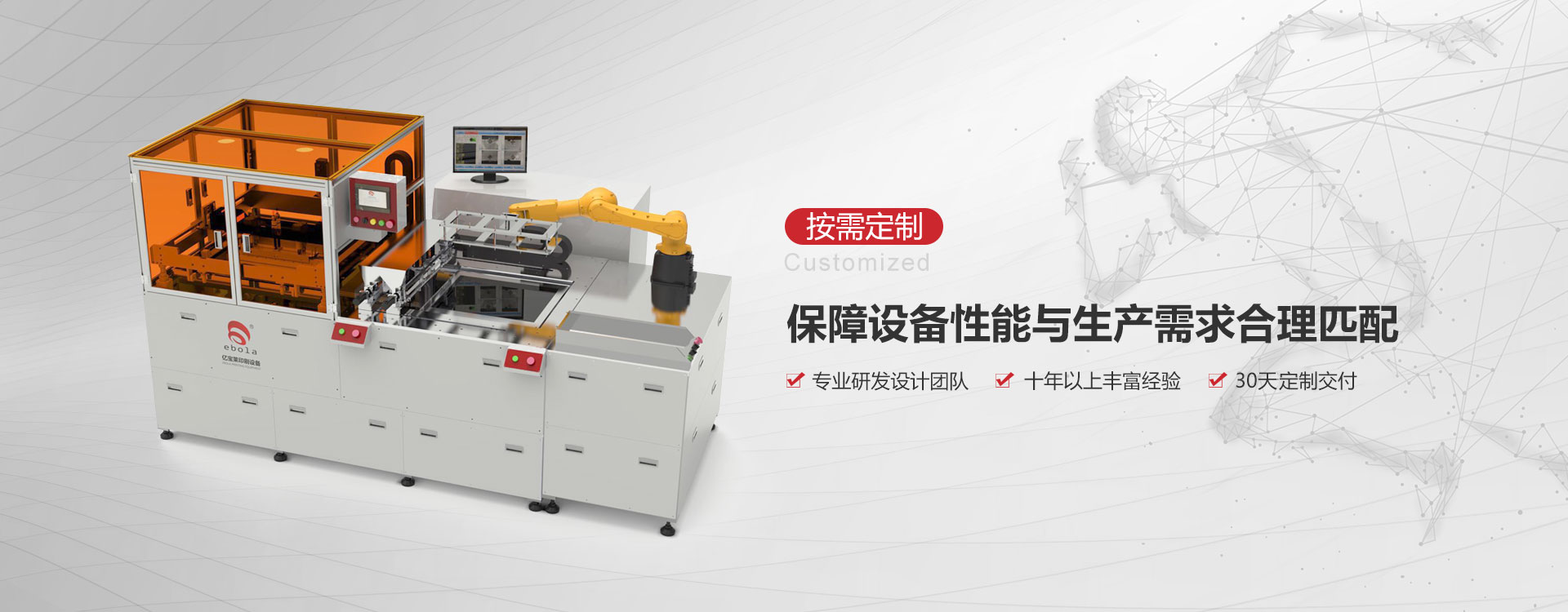 億寶萊印刷設備有限公司2008年成立于深圳,是一家專注于絲網印刷機以及相關配套設備制造、銷售的專業化印刷設備綜合服務商,公司共十大類100多個品種的產品廣泛服務于禮品包裝、電子、PCB、光伏光電、生物、陶瓷IC線路等新型產業領域。
